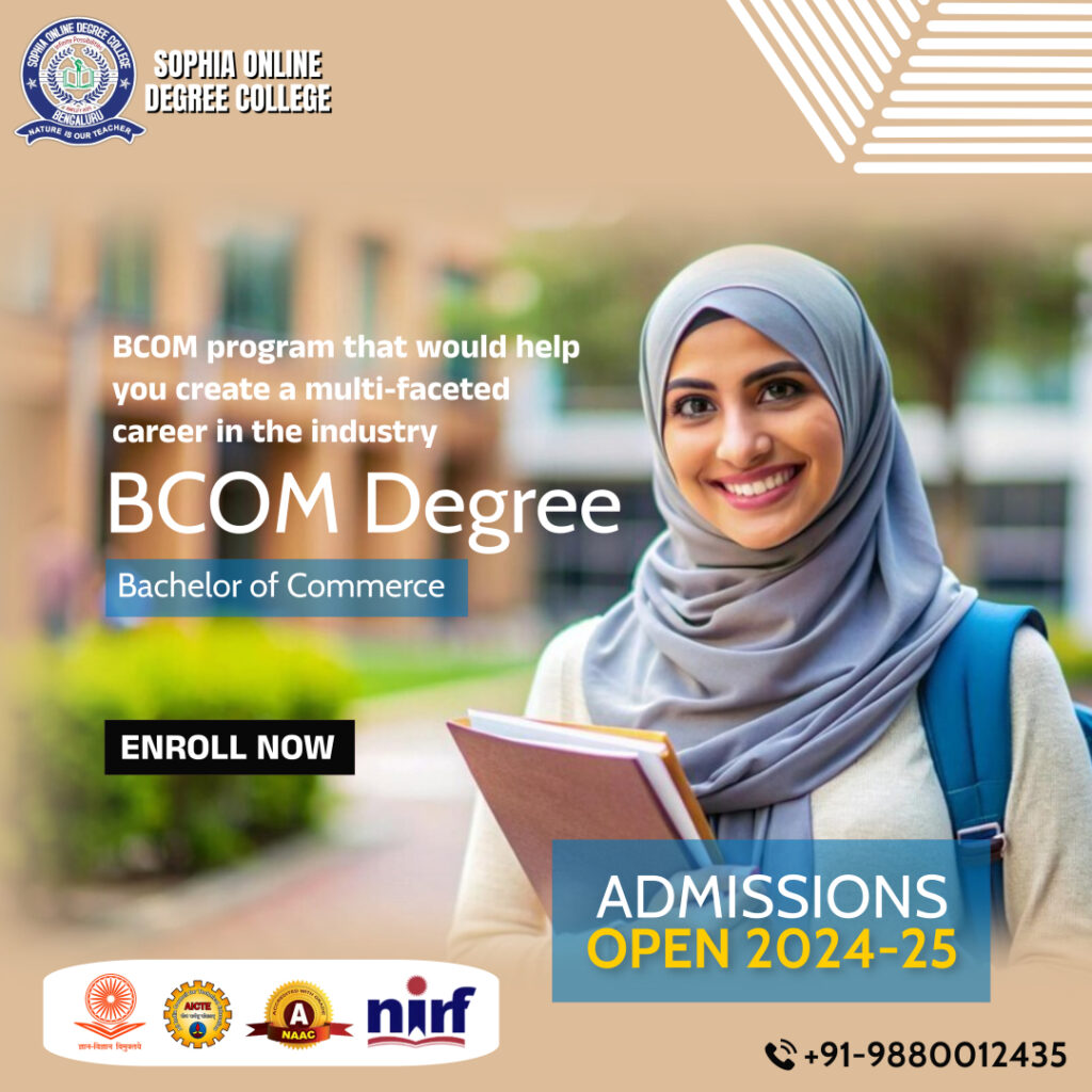 Get the admission from the best B.COM correspondence and distance learning colleges, institutes, universities, education centers today. Get in touch with Sophia Online degree College for insights on B.COM admission dates, application details, course fees, class timings, education centers, contact addresses, phone numbers, etc. A Bachelor of Commerce (B.COM) is a Management education course and shall be of two-year duration. Candidates shall appear in the final examination at the end of each academic session.