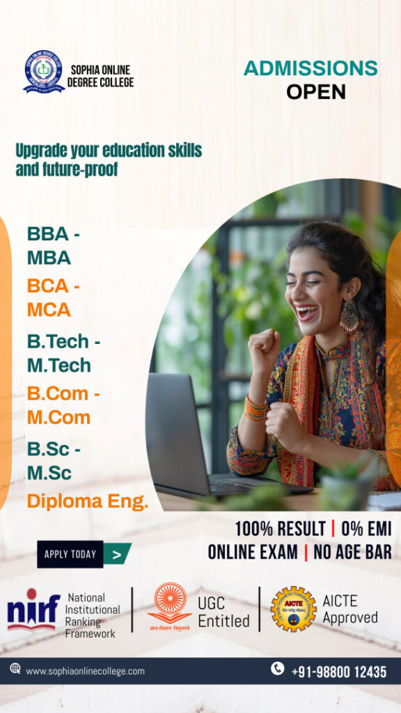 At Sophia Online College, students can also explore related flexible programs such as Online & Distance BBA, B.Com, M.Com, BCA, MCA, along with Executive MBA, all designed to support career growth with UGC-approved recognition, recorded lectures, flexible exams, and guided academic support.