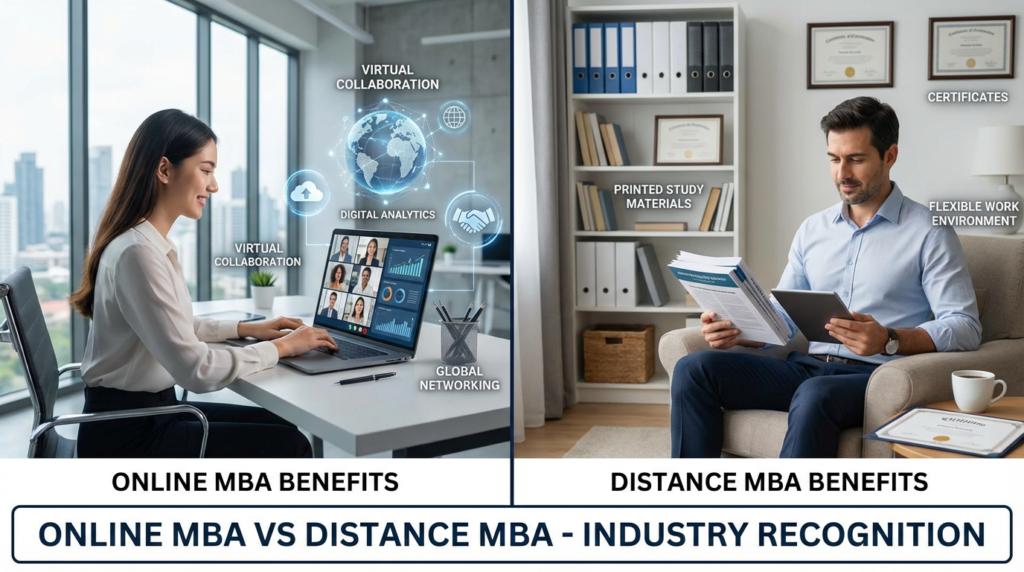 Both formats are valid and industry-recognized. An Online MBA offers interactive learning with live classes, while a Distance MBA provides flexible self-study without regular attendance.