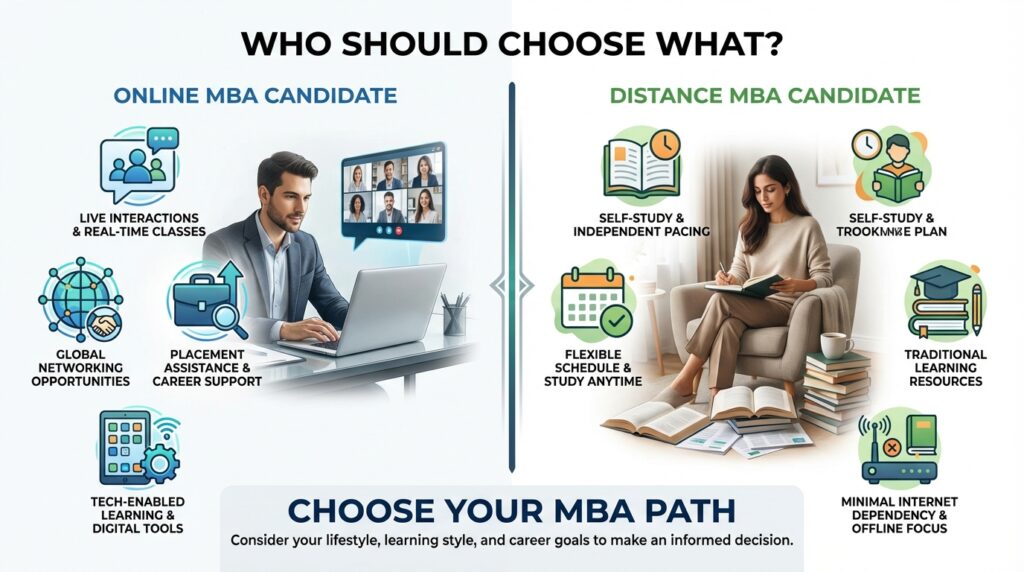 When comparing Distance MBA vs Online MBA, the decision is not about superiority, but personal fit. If live classes, corporate exposure, and interactive learning matter, an Online MBA is the ideal choice. If independent study and minimal screen time suit your routine, a Distance MBA is the better option.